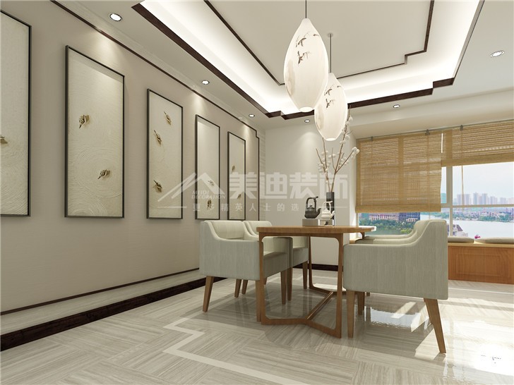 整個空間給人古風、淡雅的感覺,空間沒有主燈是現(xiàn)代風格的融入,淺色的硬包壁畫,藍色的餐邊柜和餐桌提亮了整個空間的亮度。