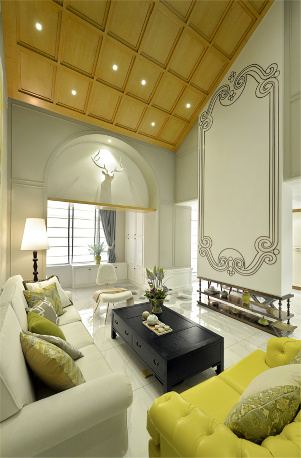 長(zhǎng)沙別墅裝修效果圖解析:整個(gè)客廳頂部吊頂區(qū)域與燈具十分相配,空間里充滿了幾何形元素,在明艷的色彩襯托下顯得整間客廳中都有種設(shè)計(jì)的空間感。