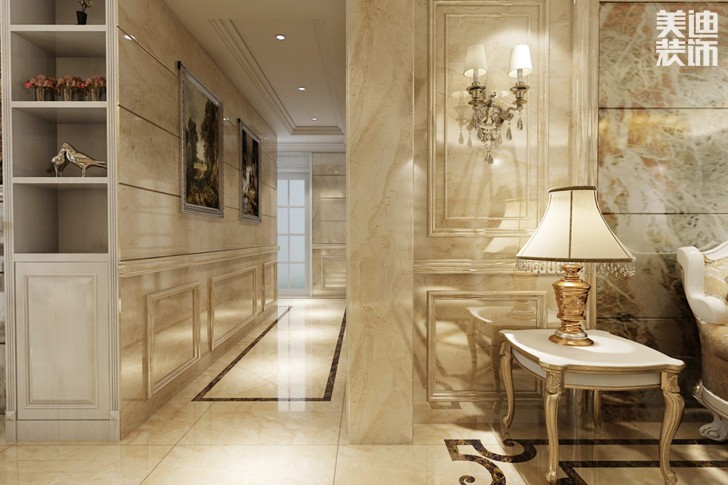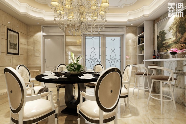 高敏設計師打破傳統歐式色調的原則,大量運用白色、米色等淺色調設計,加上少量的藍色、棕色、黃色相互碰撞使整體顏色十分飽滿。同時瓷磚上墻設計、歐式風情的壁畫、大氣流暢的吊頂,使得整個空間的映襯對比都顯得相得益彰。