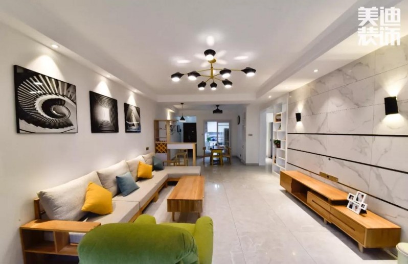 地面以淺灰色仿大理石瓷磚張貼,白色的磚讓房子的采光更好,沙發墻用裝飾畫作為點綴,格外的時尚大方。