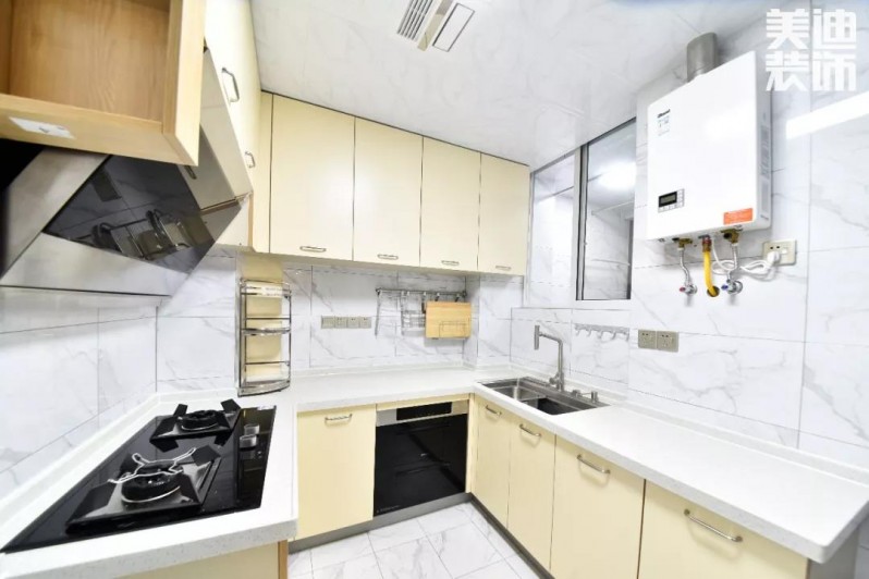 廚房關上玻璃門就可以隔絕油煙,烹飪區和洗菜池合理區分,日常使用起來會更方便。純白+原木櫥柜配色,清爽無比,做起菜來也會心情好好。