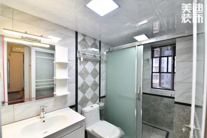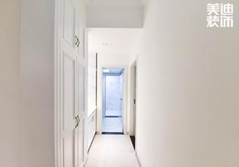 2.主臥進門過道較長,設計師張勛將衛生間門改成鉆石型,進門過道變短,柜子變長,通道流暢,通風效果更好,有效減少衛生死角。
