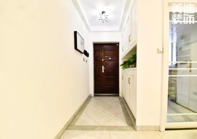 由玄關入室,便可直觀感受空間開闊。 鞋柜的底部留空處,小小的設計卻讓業主的居住過程中更加便捷,用地面瓷磚區分空間,簡單實用。