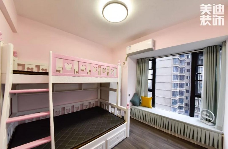 因為家里的小朋友還小,兒童房還沒正式開始裝扮,但是粉色的上下床,落地窗增加的飄窗柜,有足夠的空間供小朋友學習和玩耍。
