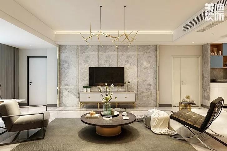 港式現代風格中,講究線條感,就像這個案例中,有垂感的燈具,利用鏡面、石材打造的幾何造型裝飾,線條干凈利落,增添了空間的立體感。