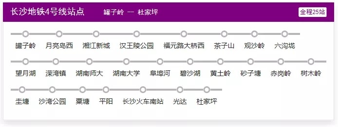 4號(hào)線一期工程全長33.5公里,設(shè)25座車站,均為地下車站,是繼2號(hào)線、1號(hào)線、長沙磁浮快線之后開通的又一條骨干線路。由西至東站點(diǎn)分別有:
