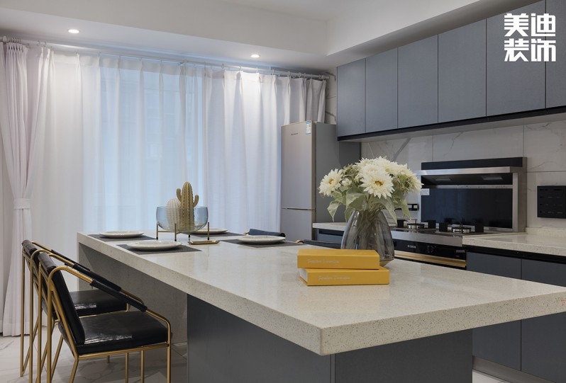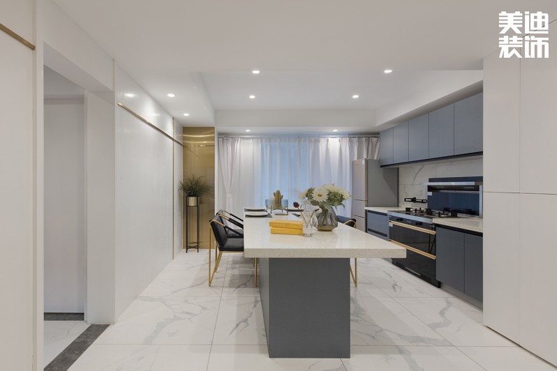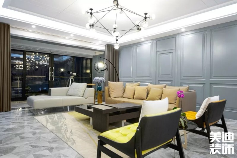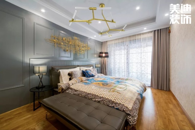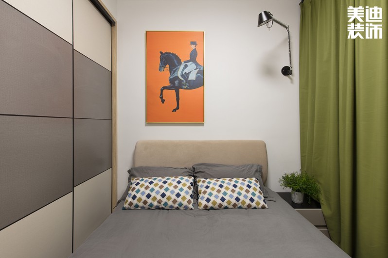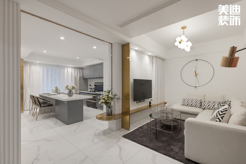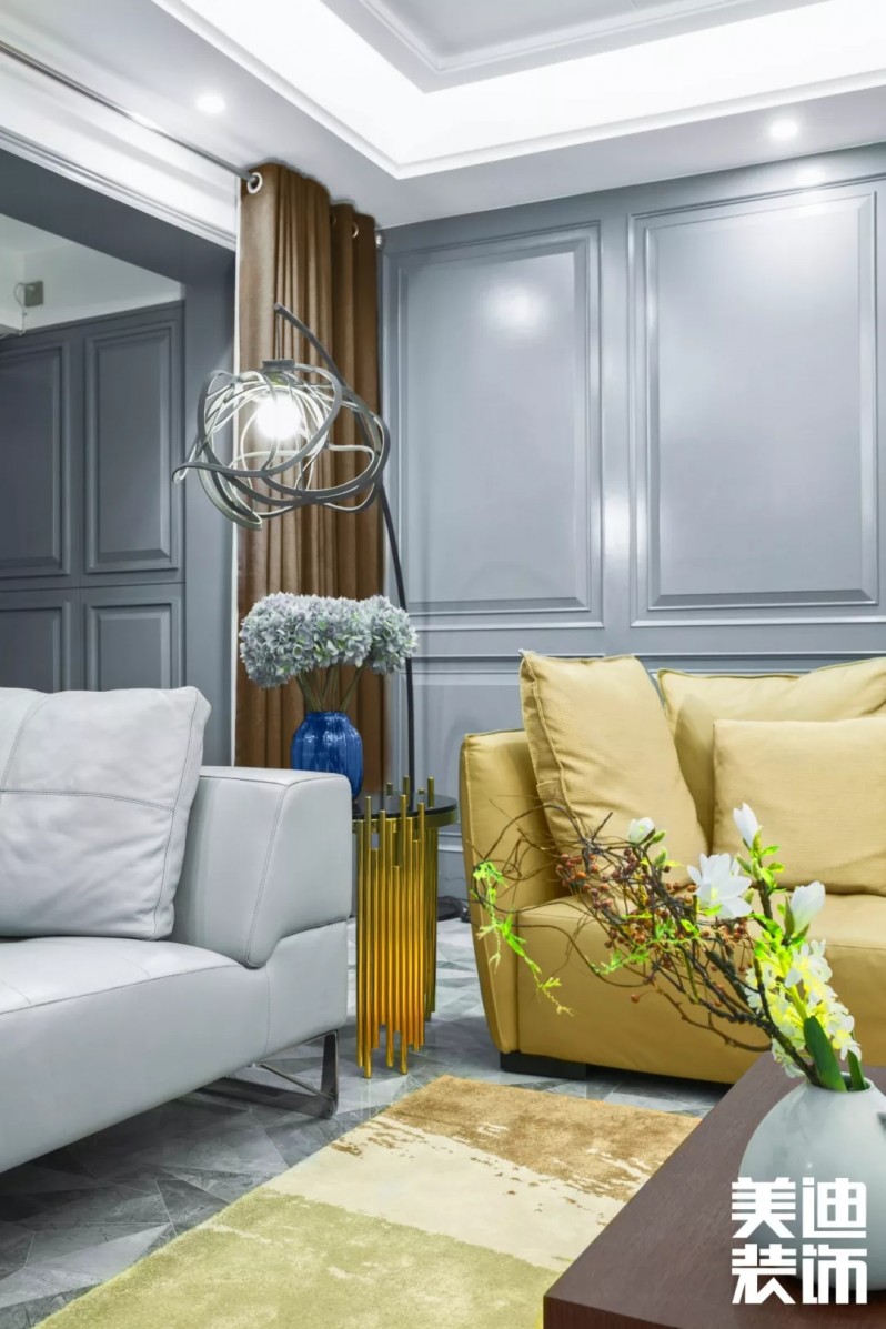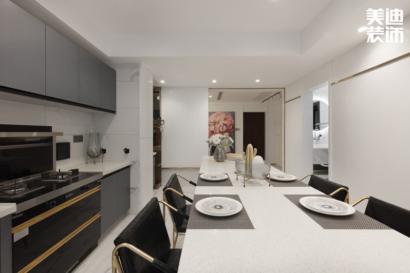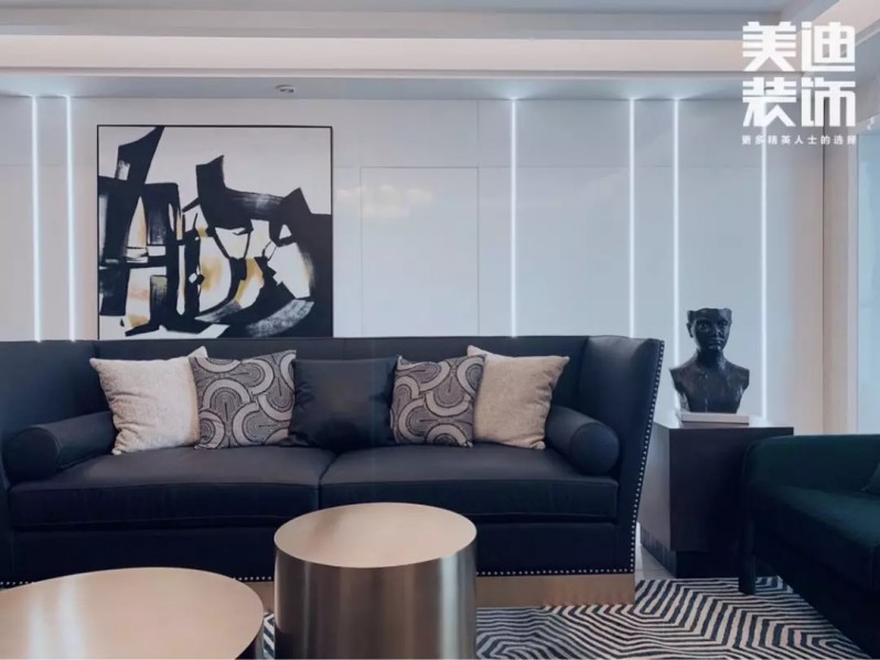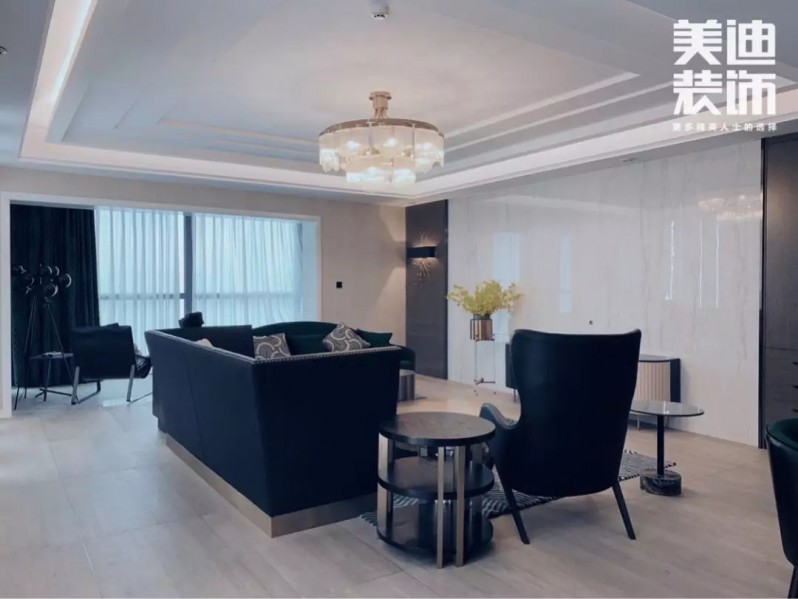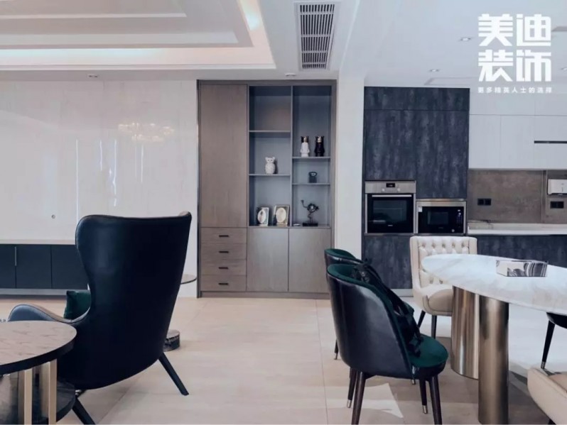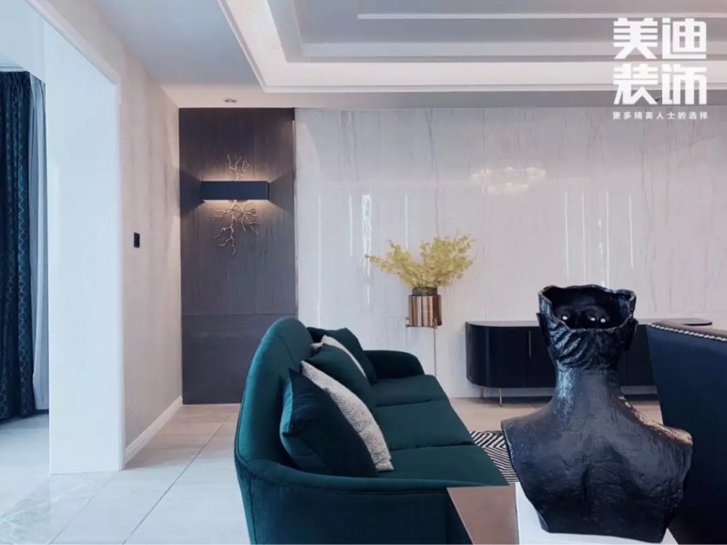不得不說現(xiàn)代風(fēng)格真是一個(gè)包容性很強(qiáng)的風(fēng)格,楊敏設(shè)計(jì)師在這套風(fēng)格設(shè)計(jì)上,前期硬裝以黑白灰為主色調(diào),后期軟裝適當(dāng)加入了輕奢風(fēng)的元素,配以孔雀綠的沙發(fā)和窗簾做點(diǎn)綴,墻面再用白色烤漆護(hù)墻板搭配線性燈,讓整個(gè)空間瞬間生動(dòng)了起來。