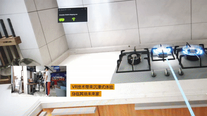 借助VR眼鏡,設計的元素和細節都體現的清清楚楚,還可以自動打開水龍頭、燃氣灶,帶來身臨其境未來家的感覺。