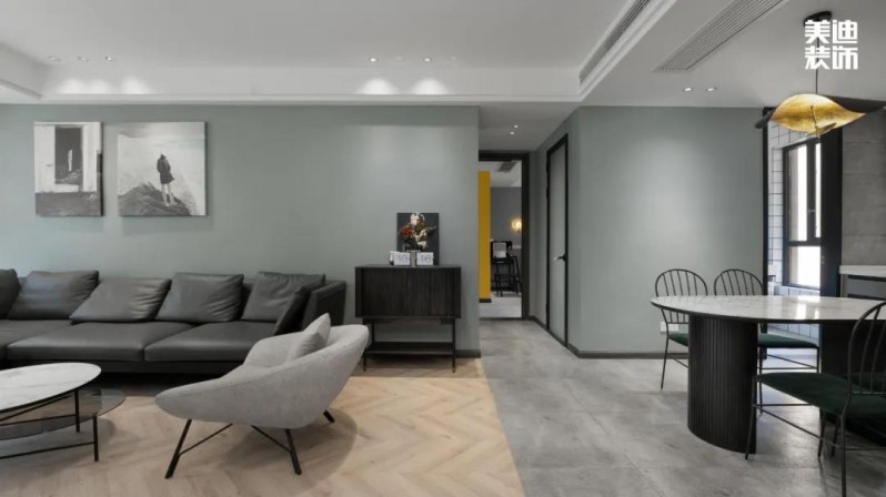 客廳地面拼花地板與餐廳瓷磚無縫拼接,自然劃出不同功能區。頂面采用的是無主燈設計,沒用傳統的吊燈,采用了當下最實用及流行的嵌入式筒射燈,以及嵌入式燈條,讓燈光營造家的氛圍。