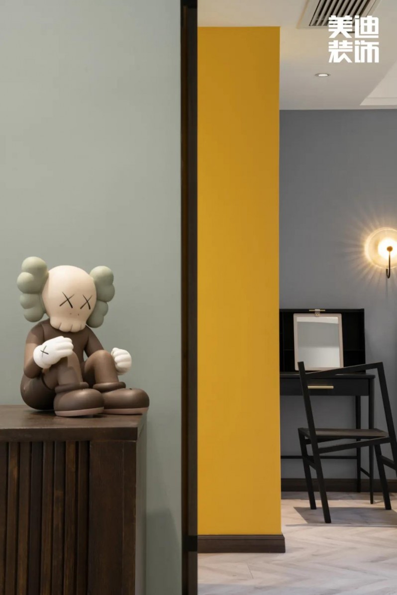 轉角黃色設計,看似突兀,實則不然,黃色的點綴讓室內環境更加輕快活潑,帶來無限活力。黃色墻面搭配木地板,自然又舒適,讓室內空間更溫馨。