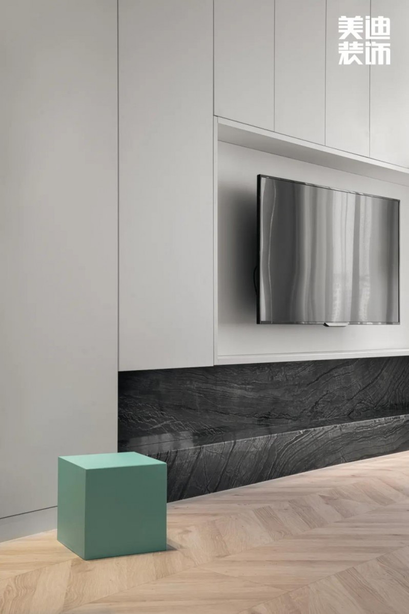 電視背景一整面墻的隱藏壁柜大氣又實用,木飾面與大理石的碰撞,高端又沉穩。靠窗戶的一面墻與電視背景相連處,窗簾收口豎面將魚骨紗巧妙隱藏在其中,視覺空間被無線放大,光線透過魚骨紗窗簾,溫暖愜意。