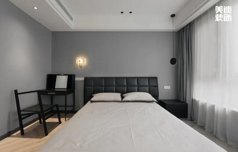 根據建筑形體設計黃色跟灰色的撞色對比,干凈整潔不失雅趣。滿頂設計,見光不見燈,床頭藝術壁燈點點光源,黑色騎士床品和梳妝臺相互依偎色調和諧。雙層絨布面料搭配魚骨紗窗簾,遮光又不失通透感的白紗,硬朗中帶有溫柔感。