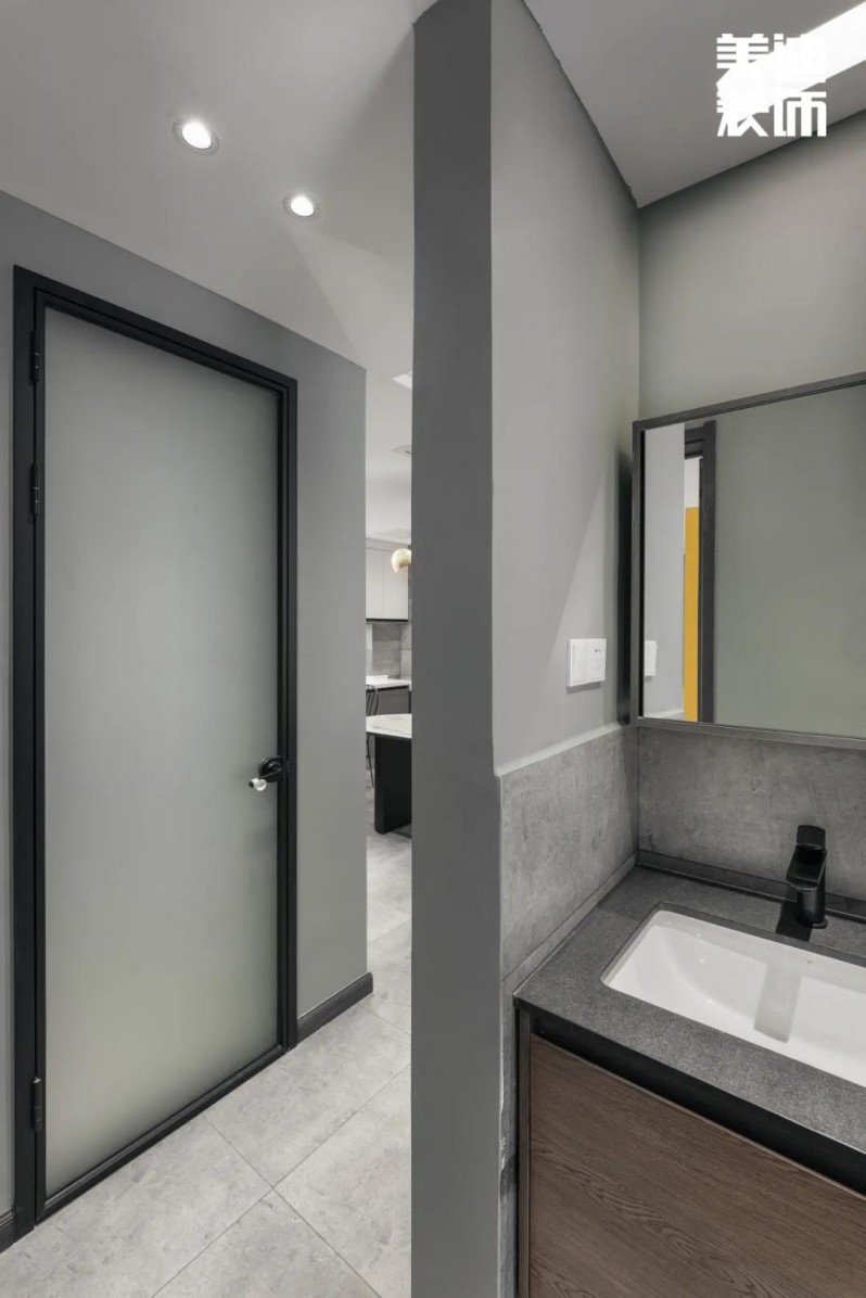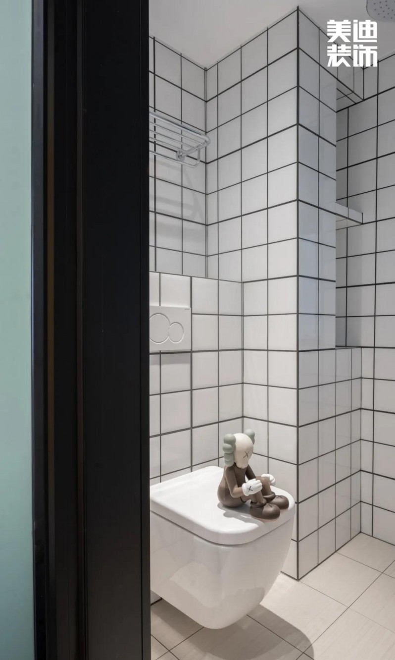 兩個衛生間采用干濕分區的設計,公衛的洗漱盆放在外面,巖板與木飾面相結合的浴室柜,時尚又舒適的視覺感受。白色地磚搭配白色小方墻磚,簡潔不單調,高級富有質感。