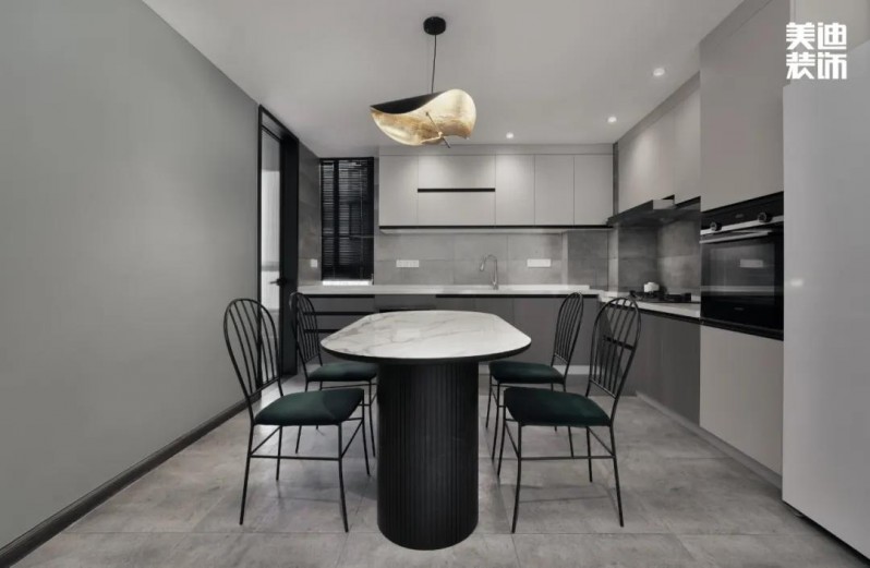 開放式廚房,邊烹飪邊和家人高談闊論,促進交流、加強感情。L型櫥柜設計,空間利用率最大化。石英石臺面,簡單大氣,不失格調。一部分為西廚,盡顯生活浪漫情調。