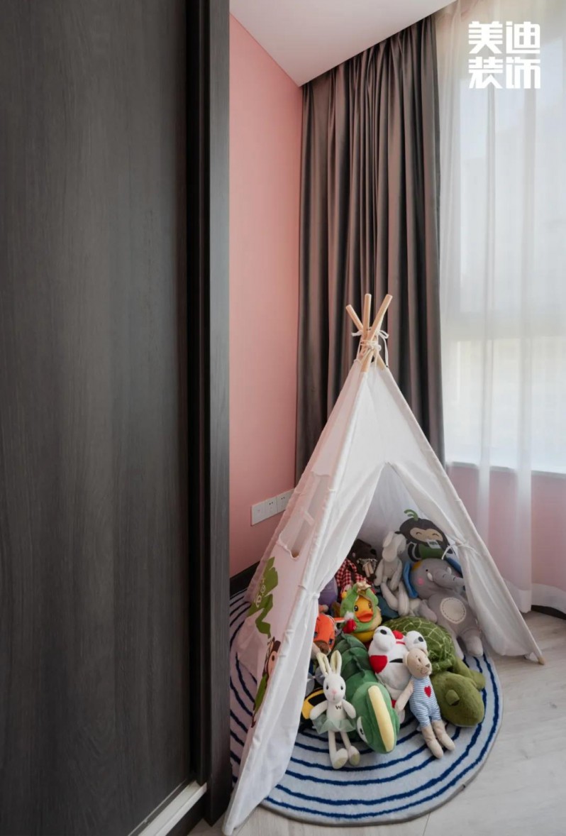 兒童房使用莫蘭迪紅色墻漆,清新可愛。窗戶角落搭了個小帳篷,童趣十足。軟萌的動物玩偶,可愛又招人喜歡,讓整個房間充滿童真趣味。