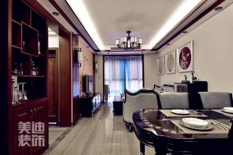 這是一張進門照,入戶和酒柜也都是廖女士很滿意的地方,經典色系的酒柜與整體的新中式風格映襯得剛剛好。