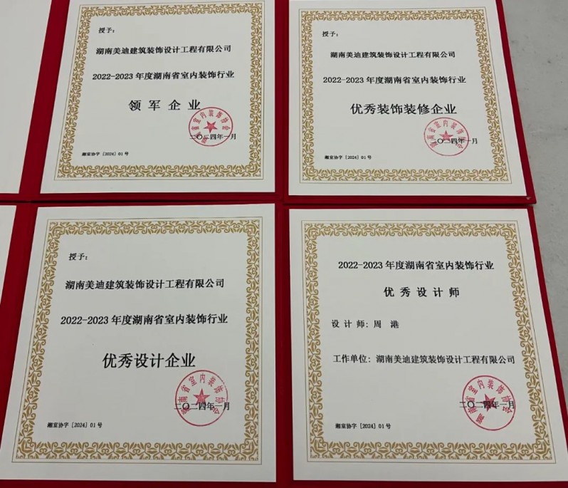 美迪裝飾在本次湖南省室內裝飾協會四屆五次理事擴大會暨行業年度頒獎大會中斬獲“2022-2023 年度湖南省室內裝飾行業領軍企業”、“2022-2023 年度湖南省室內裝飾行業優秀裝飾裝修企業”“2022-2023 年度湖南省室內裝飾行業優秀設計企業”三項行業大獎,美迪裝飾設計師周港、戴曉宇獲“2022-2023年度湖南省室內裝飾行業優秀設計師”,為企業高質量發展再添濃墨重彩的一筆。