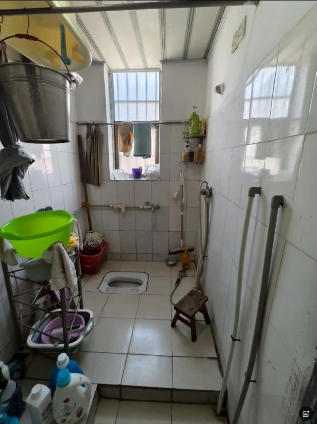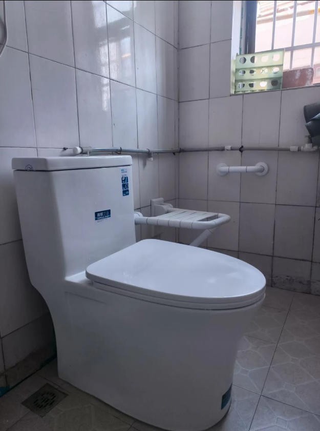 衛生間腐蝕木門更換為無障礙鋁合金平開門,同時完成了水路與電路的改造。地面鋪設了防滑地磚,還配備了防滑墊;新增的懸空式洗漱柜既節省空間又方便清潔。新安裝的坐便器旁還安裝了一字扶手、折疊淋浴椅,讓老人如廁、淋浴時都能獲得穩穩的支撐。