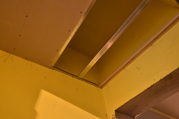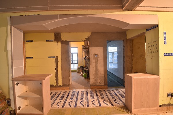 吊頂采用輕鋼龍骨材質骨架、石膏板與石膏板接口采用V型槽、石膏板轉角采用“七字角”有效防止開裂并鋪設大芯板將吊頂墻體拉直處理。